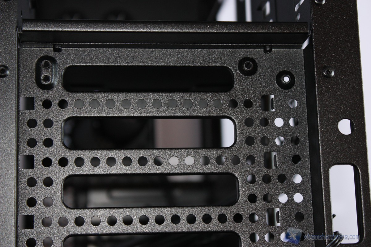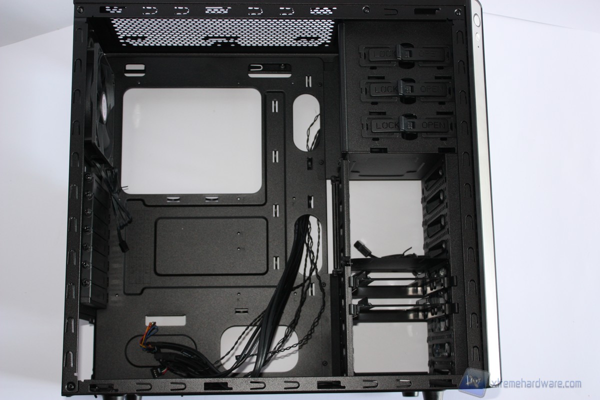Il layout interno del Centurion 6 è moderno e segue quello di altri case in commercio come la posizione dell'alimentatore nella parte bassa del case, i fori per un cable management, vani per unità ottiche tool less e cestello superiore per gli hard disk removibile oltre che slitte predisposte per l'utilizzo di SSD. L’orientamento della scheda madre è classico ATX, il posizionamento dei bay per gli hard disk è nella parte frontale con orientamento ruotato di 90 gradi. E’ standard anche il posizionamento delle periferiche da 5.25” con l'aggiunta di un sistema tool less, come pure quello dell’alimentatore inferiore dotato di gommini e filtro antipolvere. La colorazione interna è completamente nera a favore del look interno.