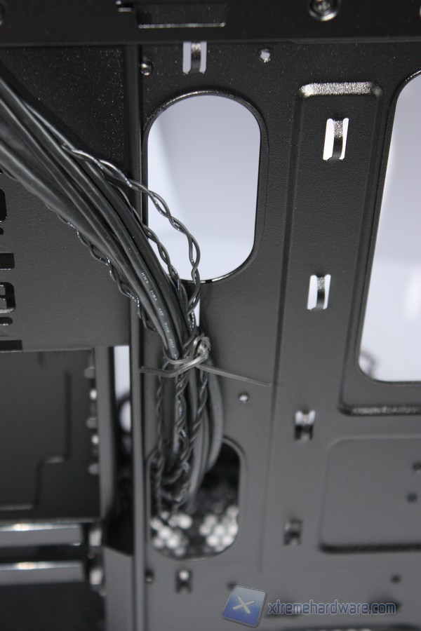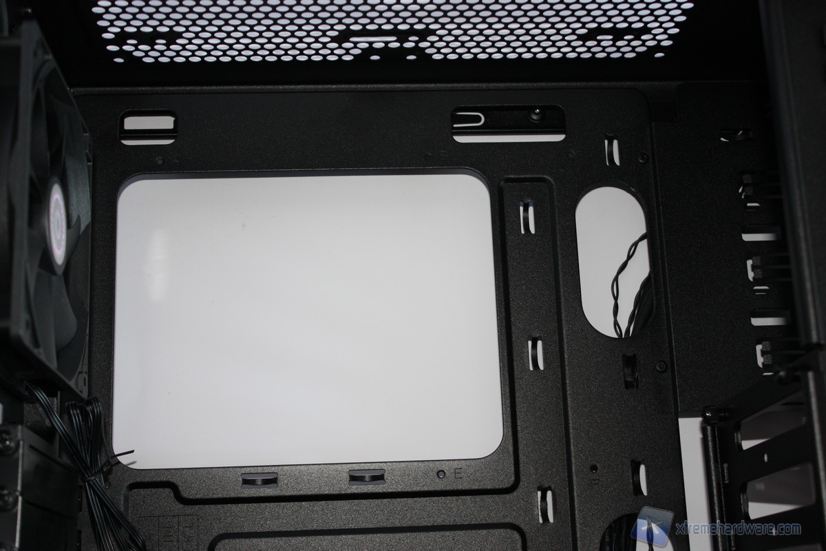 Il piatto della scheda madre è interamente in acciaio e non è removibile. La qualità, la robustezza e lo spessore sono elevati e garantiscono un più che buona rigidità strutturale. Sono presenti 3 fori sprovvisti purtroppo di guaine in gomma, che avrebbero permesso un completo cable management senza notare troppo i cavi passanti nella parte posteriore del tray della mainboard, i fori rimangono comunque utili ad un completo cable management spesso assenti o parzialmente presenti in case di questa tipologia. Nella parte superiore sono presenti due aperture e la loro dimensione è adatta al passaggio dei cavi di alimentazione e di molti connettori delle ventole, quindi ciò è un deciso punto a favore. Il tray della mainboard è dotato anche di un ampio foro per l'installazione agevolta di dissipatori di qualsiasi tipologia senza dover smontare la scheda madre o altri componenti. Inoltre il Centurion 6 garantisce un ottimo occultamento dei cavi nella parte posteriore il tray della mainboard anche e grazie ai circa due centimetri di spazio dalla paratia laterale.