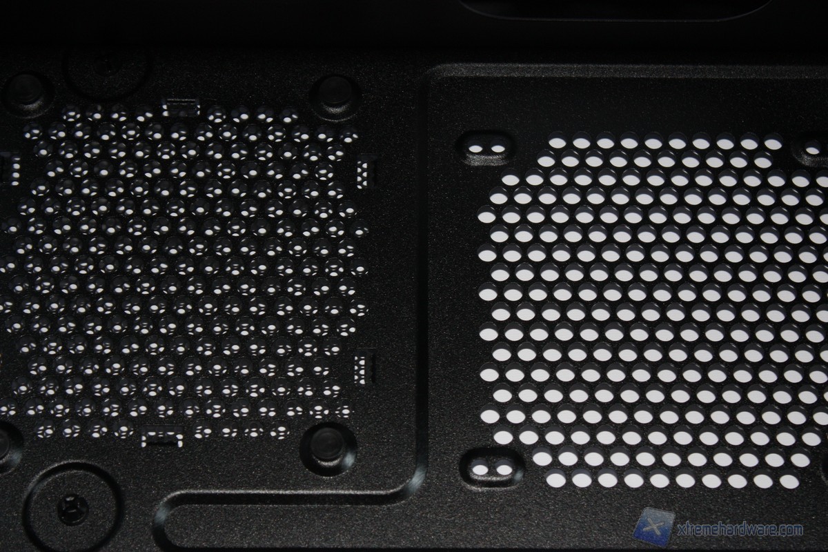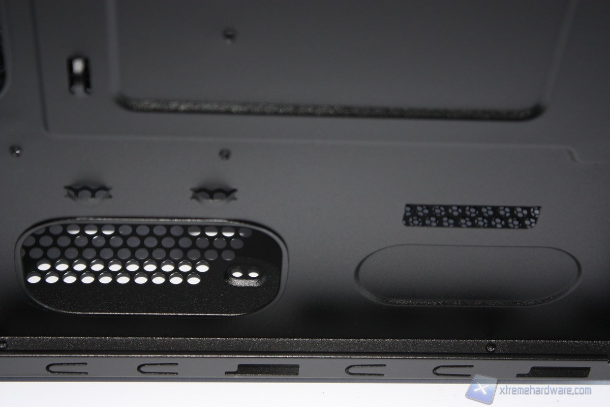 Diamo ora uno rapido sguardo alla zona alimentatore. Tale zona, come abbiamo accennato nel paragrado parte inferiore, è dotato di gommini che isolano l'alimentatore dalla base e struttura del case cosi da non trasmettere vibrazioni generate dalla ventola dell'alimentatore in azione. Ovviamente la zona è dotata anche di un filtro antipolvere in modo da intasare in maniera rapida l'alimentatore e quindi per preservarne l'integrità. A lato della zona alimentatore inoltre è presente una griglia adibita ad una ventola da 120 o 140mm che ovviamente non è inclusa e sarà da acquistare a parte. La zona alimentatore è abbastanza ampia e permette di installare alimentatore anche più lunghi di 160mm ovviamente sacrificando l'area adibita ad un ulteriore ventola. Abbiamo inoltre possibilità di montare l'alimentatore, anche grazie ai fori predisposti, sia con la ventola che prende aria dal fondo del case che con la ventola rivolta verso l'interno del case quindi ad assorbire il flusso d'aria calda che si genererà. L'orientamento in questo caso è a discrezione dell'utente ma in questo caso ne possiamo consigliare l'installazione in entrambi i modi anche grazie alla ventola in immissione posta nel frontale del case.