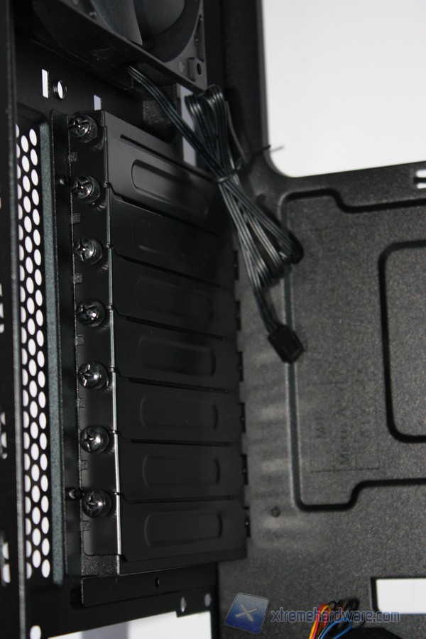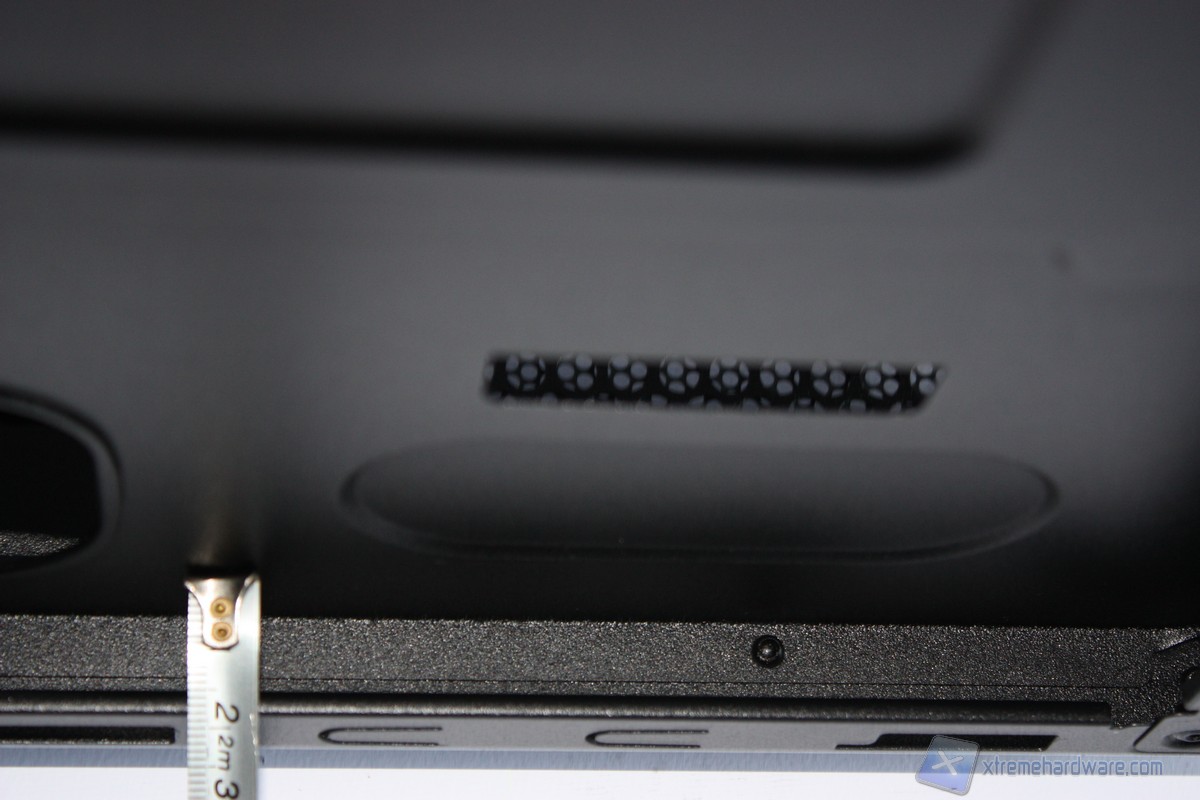 Il Centurion 6 nel retro è dotato di una ventola da 120mm in colorazione nera fornita in molti case del brand Cooler Master. Tale ventola ha una buona pressione e gli rpm si attestano a circa 1200 con un emissione sonora di circa 18 dB al massimo dei giri. E' una ventola che ovviamente potrà essere sostituita con una di pari grandezza in qualsiasi momento l'utente voglia. Al di sotto di tale ventola troviamo gli slot PCI che in questo caso sono sette. Gli slot sono protetti da coprislot in metallo nero come del resto tutto il case. Essi non sono forati per permettere un ulteriore ricircolo d'aria ma sono chiusi e forse ciò potrebbe penalizzare un pochino le temperature della scheda video ma comunque nulla di allarmante e sempre nei limiti. I copri slot sono sostenuti da viti tool less che comunque hanno un incavo nel caso si voglia utilizzare un cacciavite per conferire maggiore presa sulle schede poste negli slot pci della scheda madre.