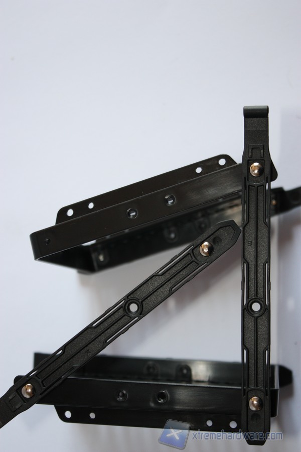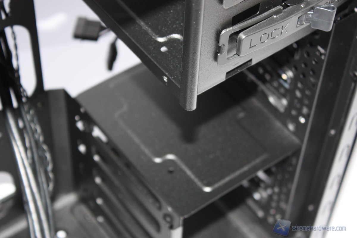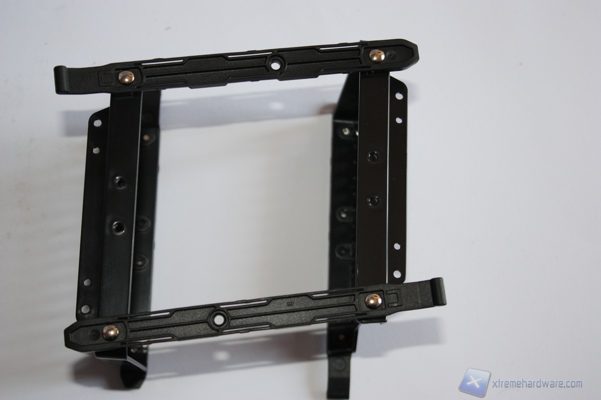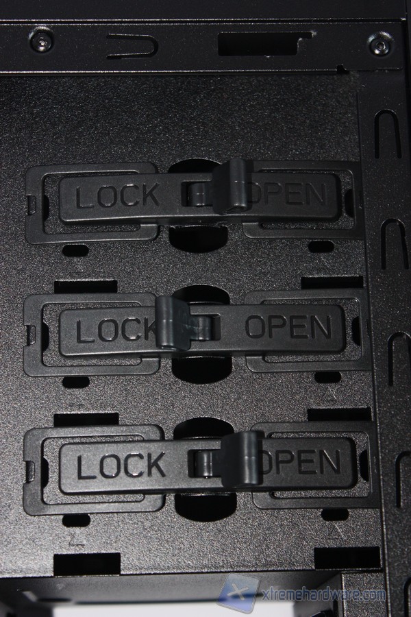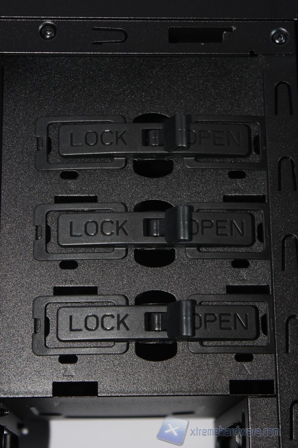 Passiamo ora a dare uno sguardo al cage delle unità ottiche che come abbiamo detto è di tipo tool- less e ciò permetterà un immediata installazione delle unità ottiche senza aver bisogno di utensili dedicati quali un cacciavite. Il sistema di caratterizza di slitte in plastica con uno switch plastico a due posizioni che azionerà o meno l'innesto di due pioletti in metallo che manterranno in sede l'unità. Tale sistema è da tempo usato in moltissimi case del brand Cooler Master ma anche in altri case data la facilità e l'ottima solidità che riescono a conferire all'unità una volta montata, e riducendo cosi l'impiego di viti metalliche.