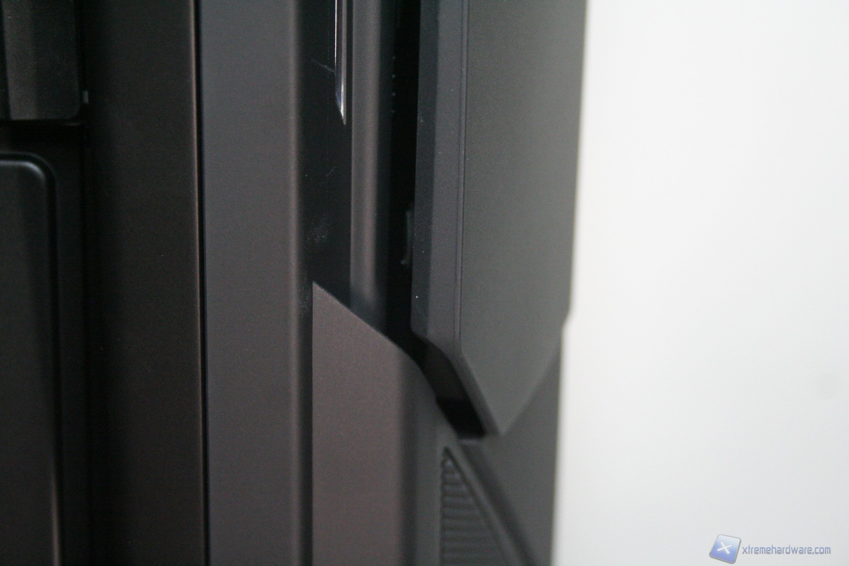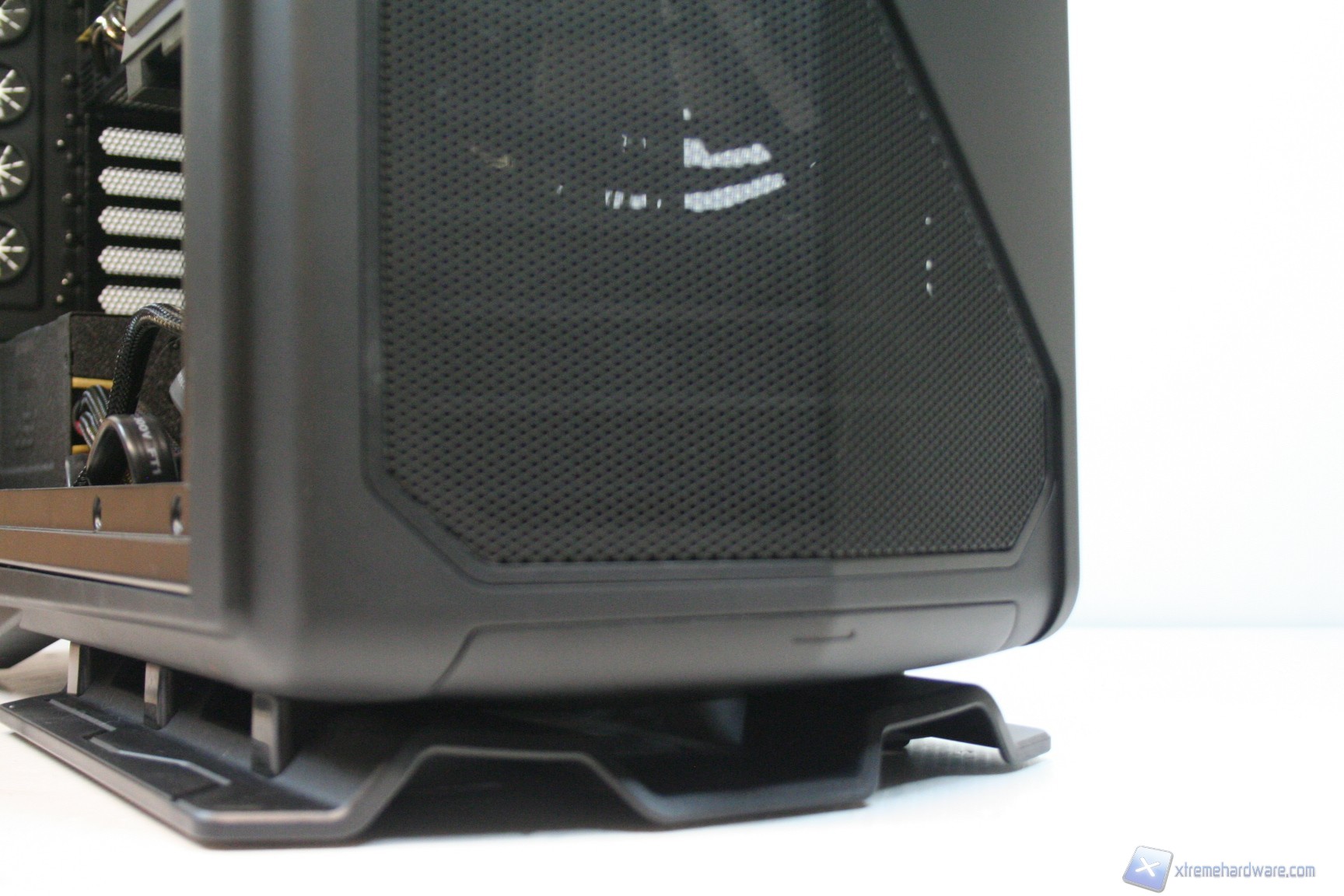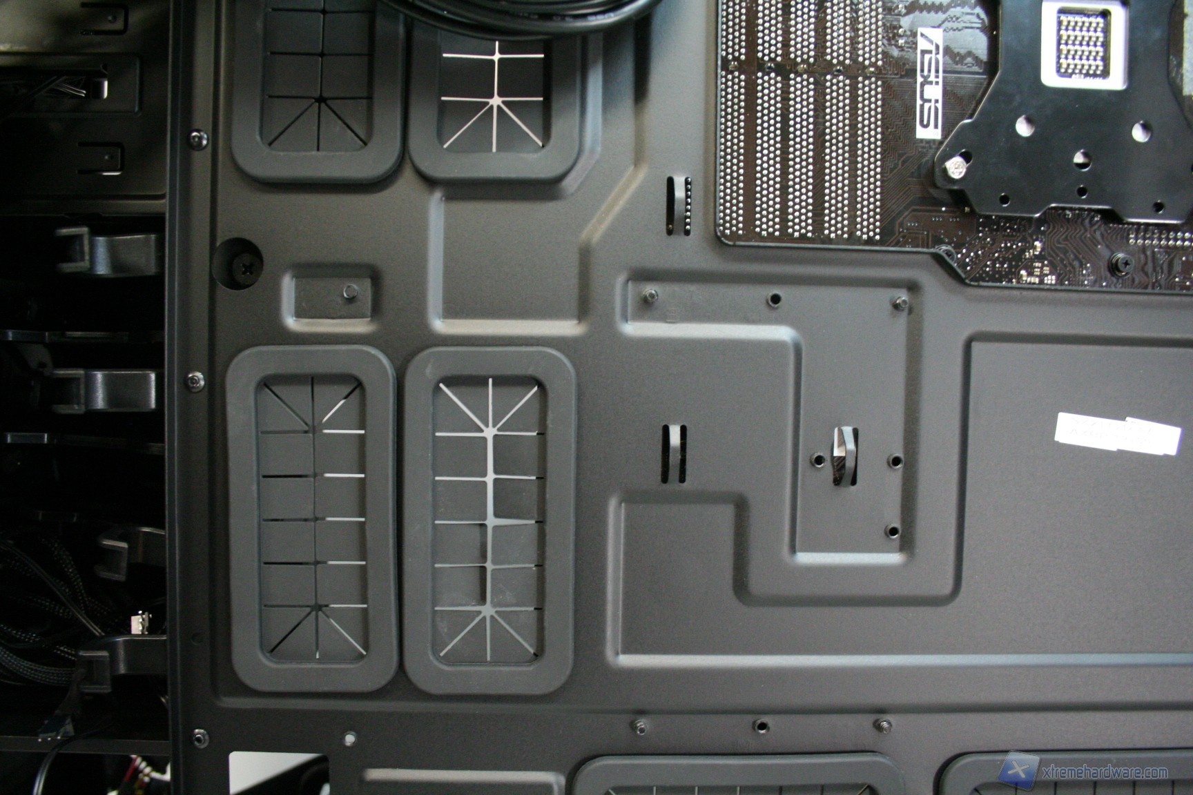 Il design del telaio è moderno, e le paratie sono decisamente robuste. Similmente al Phantom 630, presenta dei cage per gli hard disk, uno dei quali però è removibile (quello inferiore); tale caratteristica permette una compatibilità elevata, sulla carta, con radiatori a liquido molto grandi, tra cui modelli da 280mm di lunghezza. Ci sono molti elementi innovativi in quanto nella famiglia Phantom troviamo una predisposizione per ventola da 120/140mm direttamente al lato della paratia degli hard disk, diretta verso le schede grafiche e le RAM, liberamente configurabile. Le aperture per il cablaggio sono numerosissime, ben 11 in totale, considerando anche l’unica non gommata per la presa di alimentazione EPS12V della CPU. La facilità di assemblaggio è estrema, date le generosissime dimensioni. Il piatto della scheda madre è interamente in acciaio, e diversamente da alcuni modelli di cabinet top di gamma degli anni passati, non è removibile. Le 10 aperture rimanenti sono dotate di una gomma molto resistente alla rimozione accidentale, deciso punto a favore dato che non è cosa comune, purtroppo.