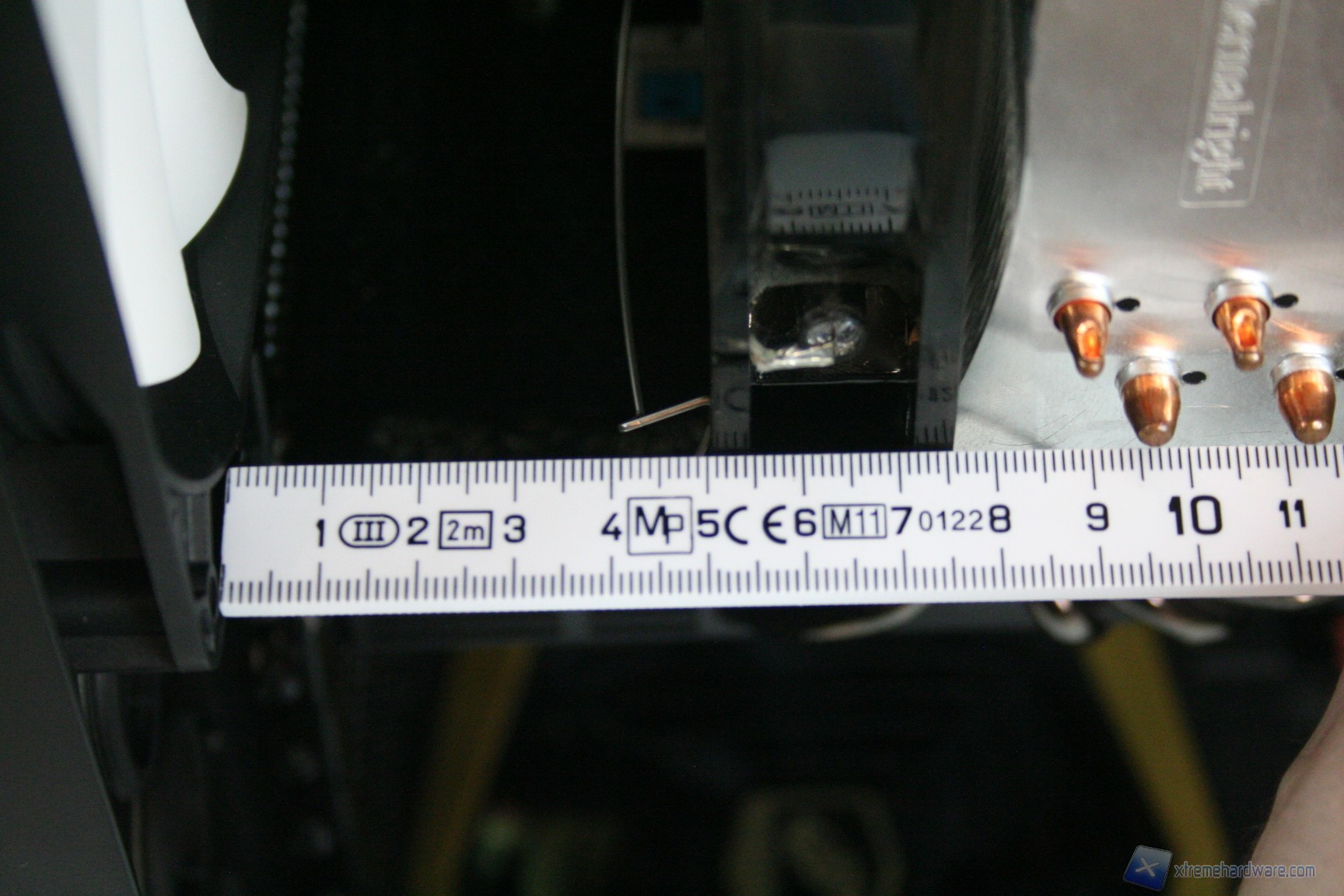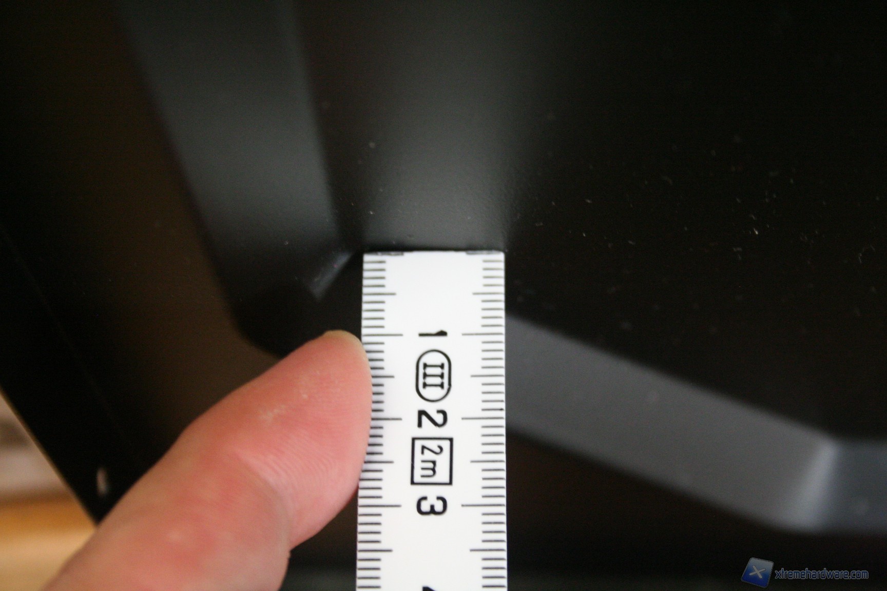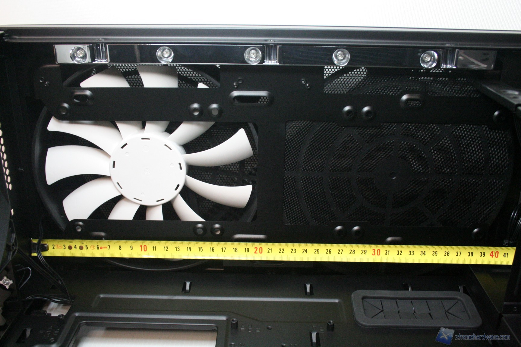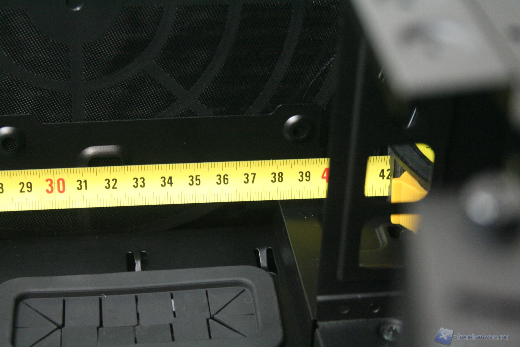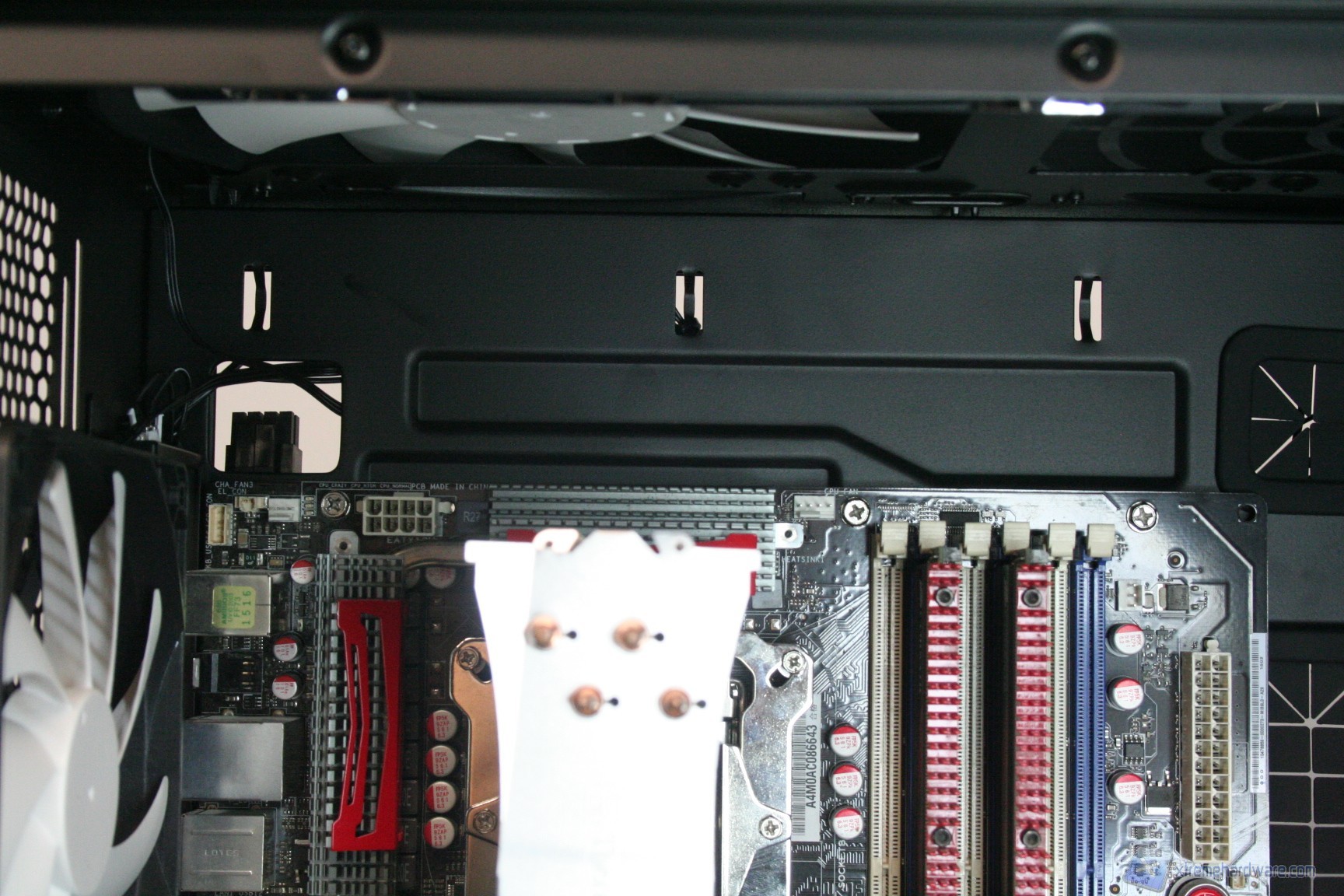Cosa possiamo dire dello spessore posteriore? Purtroppo non lo stesso della parte anteriore, per via di una semplice ragione ovvero la riduzione in spessore rispetto alla versione 630, ed anche la diversità nella tipologia della paratia in quanto nell’830 troviamo uno spessore posteriore “proprio’’ di 1.68cm, anche se però la paratia laterale è bombata in corrispondenza dei cavi posteriori, di circa un centimetro, portando quindi lo spessore misurato a 2.7cm, contro i 3.0 del Phantom 630, che invece sono generali in quanto non è presente la bombatura posteriore. Indubbiamente questo implica il fatto che quest’ultimo è un progetto, se vogliamo, più moderno per alcuni elementi, per cui è  possibile che sia in cantiere una versione migliorata del Phantom 820, chiamata appunto Phantom 830. A parte questo piccolo dettaglio, il modello 820 permette l’installazione di radiatori decisamente più spessi nella parte superiore, direttamente sopra la scheda  madre, cosa non da poco per questa tipologia di cabinet! Il foro di alimentazione della CPU è grande ed oltretutto nella parte posteriore è preinstallata una prolunga di alimentazione! Osserviamo la parte superiore: