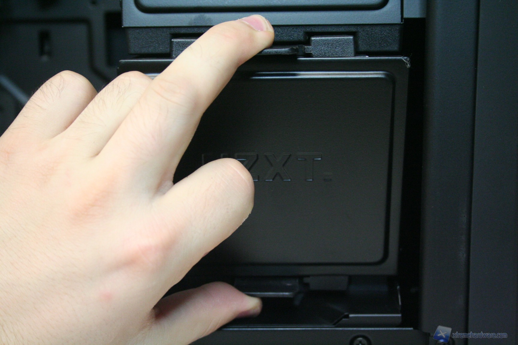 Per quanto riguarda le periferiche da 5.25” c’è un sistema proprietario, che permette un installazione immediata, anche se dobbiamo ammettere che è forse leggermente troppo duro, e non permette un serraggio forte delle periferiche. Oltretutto qualora fossero corte, ad esempio nel caso dei fan controller, è necessario utilizzare comunque delle viti; sarebbe opportuno che NZXT integrasse un sistema meno impegnativo, con una compatibilità maggiore e che permetta quindi un maggiore grado di stabilità. Da notare il fatto che il Fan Controller Lamptron FC5V2 non entra perfettamente: