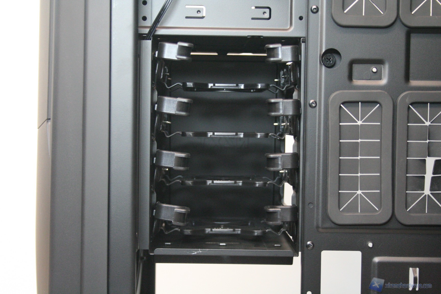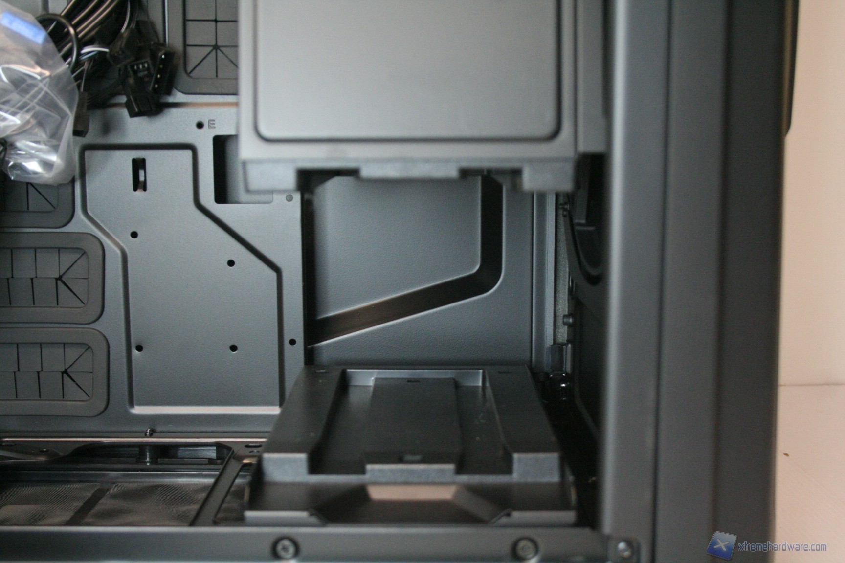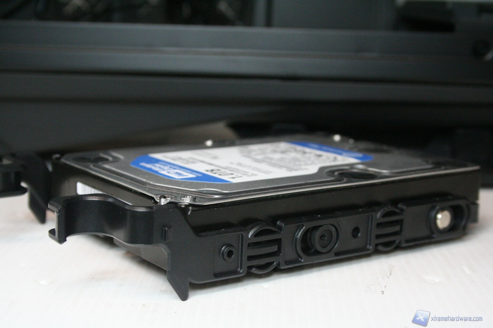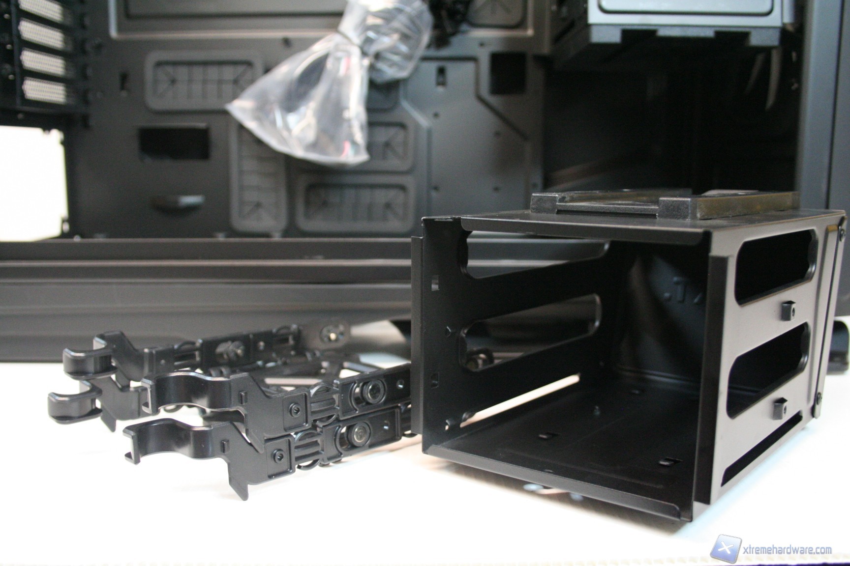La gestione dei dischi rigidi è molto buona in quanto è presente un sistema che permette un facile controllo delle periferiche, sebbene non siano presenti predisposizioni per sistemi hot-swap. Il sistema di aggancio, per quanto valido, è leggermente lasso, con gli hard disk non installati. E’ presente un sistema di assorbimento delle vibrazioni simile ai modelli Silverstone ed è anche possibile rimuovere il cage inferiore, per poter così installare un radiatore da 280mm, con annesse ventole!