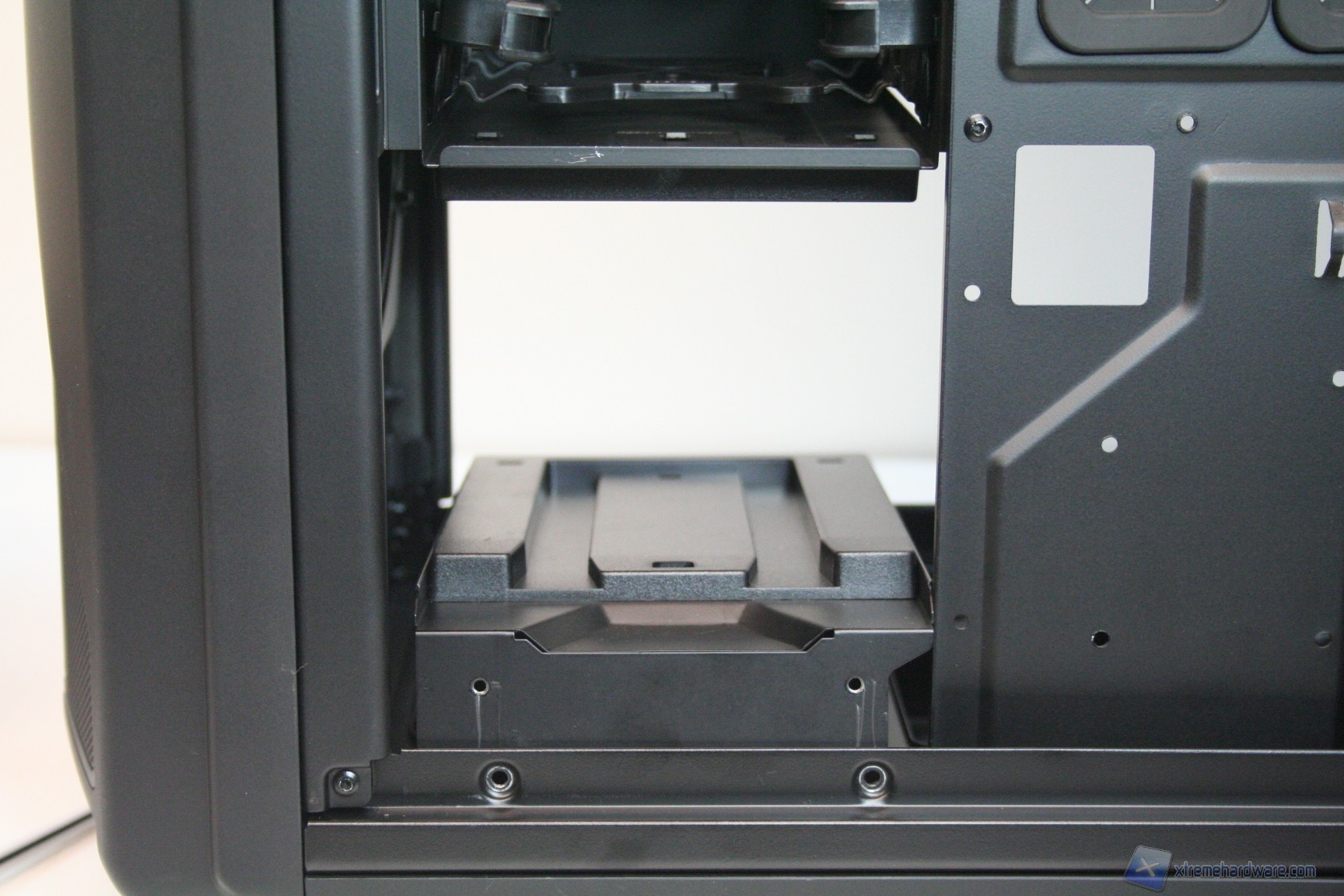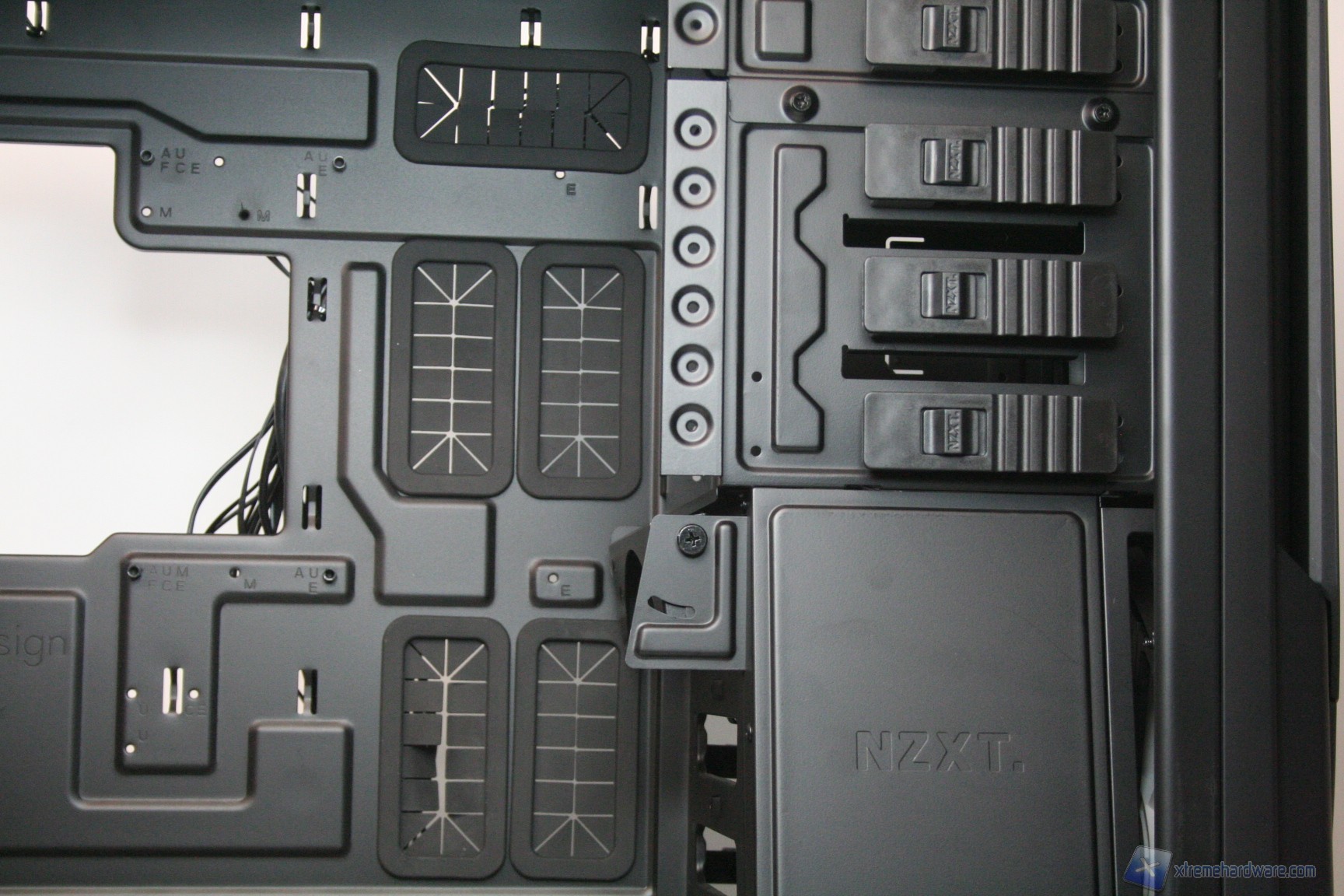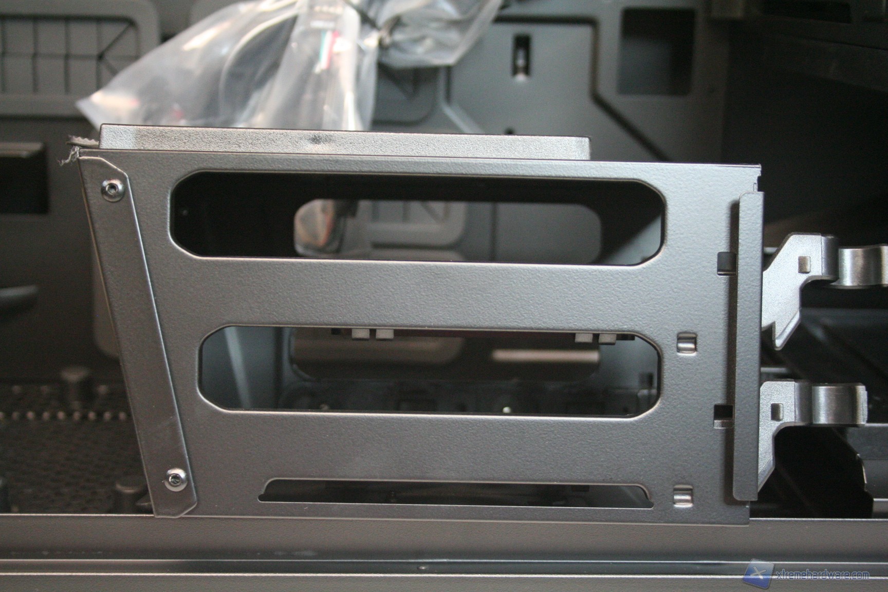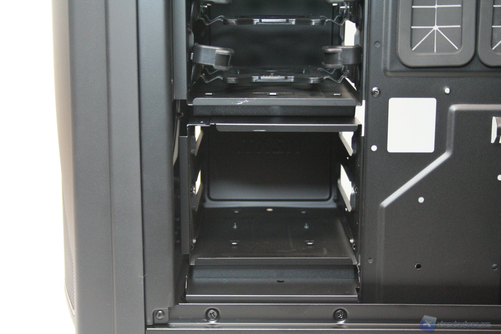 La gestione dei dischi rigidi è molto buona in quanto è presente un sistema che permette un facile controllo delle periferiche, sebbene non siano presenti predisposizioni per sistemi hot-swap. Il sistema di aggancio, per quanto valido, è leggermente lasso, con gli hard disk non installati. E’ presente un sistema di assorbimento delle vibrazioni simile ai modelli Silverstone ed è anche possibile rimuovere il cage inferiore, per poter così installare un radiatore da 280mm, con annesse ventole!